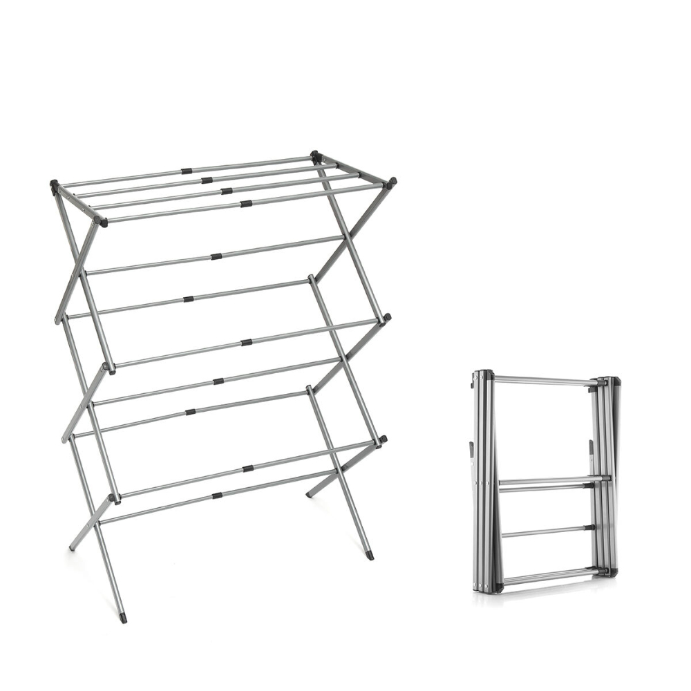 A foldable and extendable clothes dryer with 3 height levels. Ideal for hanging clothes and optimising space during use and storage. Its design allows it to be adapted to the amount of clothes to be hung each time, it is very convenient to store and takes up a minimum amount of space. This original high-capacity metal clothes dryer has 11 drying bars, is compact, lightweight and waterproof. It includes an illustrated manual for its use and is easily assembled without requiring any tools.